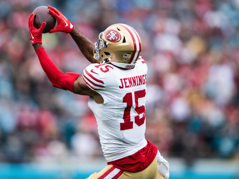 Jauan Jennings (San Francisco 49ers). Il est actuellement 20ème WR et sauter au plus vite dessus s'il est libre. Il est le WR des 49ers le plus ciblé ces derniers temps, il a pris le dessus sur toute l'escouade. (Point Moyen : 15)